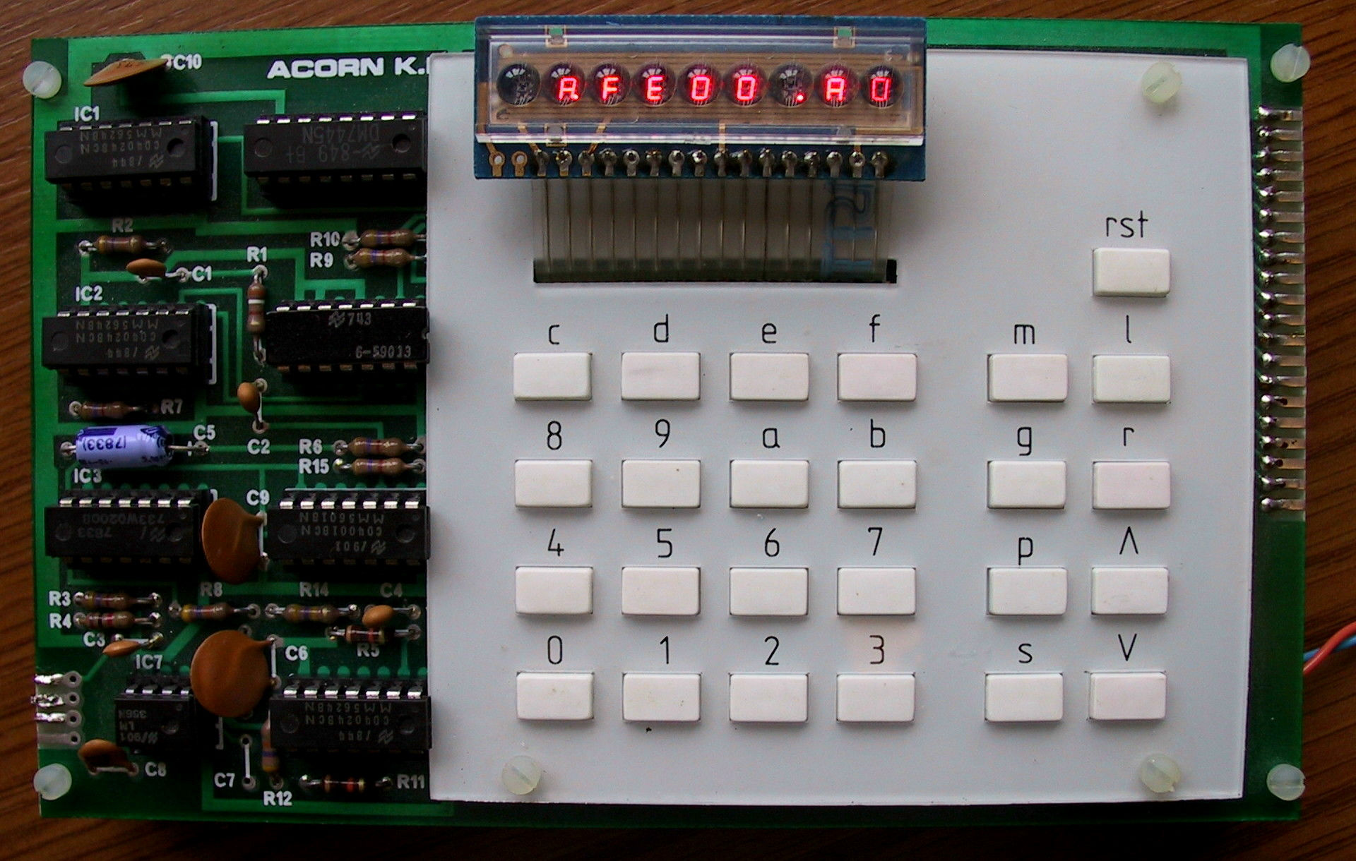 The computer was primarily sold as a kit; two Eurocard boards (160mm x 100mm) had first to be populated and wired together. These form a self-contained and unusually compact computer, needing only a 9-volt power supply. The visible (top) board is the Acorn Keyboard: