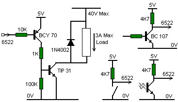 In order to add any of the ATOM extensions it is necessary to open the case. Unplug the ATOM power connector before taking the case apart. Under the case two screws are undone to remove the case bottom allowing access to the component side 2 of the circuit board. When it is necessary to solder in extra IC sockets the board is removed from the top of the case by undoing the screws at each corner of the board. The case is assembled as described in the Construction Procedure. LOWER TEXT SPACE EXTENSIONThe first extension usually required is more RAM for BASIC text space. The unexpanded ATOM has 1024 bytes (1Kbyte) of RAM provided by ICs 42 and 43 of which 512 bytes is the upper text space and 512 bytes is the video RAM. Every time the ATOM is powered up or reset it automatically checks to see if there is RAM in the lower text space and uses it for programs if pre-ent; otherwise it defaults to the upper text space. Each 1024 bytes of RAM is provided by two 2114-Ls and these must be added in pairs. Each pair of 2114-Ls will provide text space for about 64 lines of BASIC. To use the lower text space IC6 must be fitted; this is a 74LS138 in a 16 pin socket. ICs 10 to 19 provide for up to 5 Kbytes of space and they must be added in the order 10 and 11, 12 and 13, 14 and 15 etc. They are all 2114-L types and they require 18 pin sockets.The memory addresses contained by each pair of ICs are as follows: ICs 10 and 11 #2800 to #2BFF. ICs 12 and 13 #2C00 to #2FFF. ICs 14 and 15 #3000 to #33FF. ICs 16 and 17 #3400 to #37FF. ICs 18 and 19 #3800 to #3BFF. The # sign above indicates a hexadecimal number, #400 = 1024 bytes. Each 2114-L consumes around 35mA, so an ATOM with the full 5K of lower text space will require about 1125mA. VIDEO GRAPHICS EXTENSIONMore graphics RAM can be added increasing the screen resolution and allowing the use of the higher graphics modes. These modes are described in the book 'Atomic Theory and Practice' and they each require different amounts of video RAM provided by fitting pairs of 2114-Ls as follows: ICs 42 and 43 1024 bytes = 1 KByte. ICs 40 to 43 2048 bytes = 2 KByte. ICs 38 to 43 3072 bytes = 3 KByte. ICs 32 to 43 6144 bytes = 6 KByte. If only ICs 42 and 43 are in use the fitting of IC30 is optional. When IC30 is not present a wire link, LK1 on side 2, must be soldered on the circuit board. IC30 is a 74LS138 in a 16 pin socket and when it is fitted the wire link must be cut or removed, ICs 32 to 41 may then be added. The address locations provided by each pair of 2114-Ls are as follows: ICs 42 and 43 #8000 to #83FF. ICs 40 and 41 #8400 to #87FF. ICs 38 and 39 #8800 to #8BFF. ICs 36 and 37 #8C00 to #8FFF. ICs 34 and 35 #9000 to #93FF. ICs 32 and 33 #9400 to #97FF. Each 2114-L consumes about 35mA and so ATOMs with a 5 Kbyte lower text space and the 5 Kbyte video RAM extension (i.e. a total video RAM of 6 Kbytes) will require an 1500mA supply. FLOATING-POINT EXTENSIONA Read Only Memory containing the floating point, scientific functions, and colour routines may be added to the ATOM. This ROM goes in position IC21 on the circuit board using a 24 pin socket and the extra current consumption is negligible. VERSATILE INTERFACE ADAPTORThe VIA is a 6522 device requiring a 40 pin socket and fitted in the ICl position. It provides two input/output ports each having 8 data bits and 2 control lines. These lines appear on the 64 way connector, PL6, which is of the Vero 17-3704L type and the pin numbers are given on the circuit diagram. The base address of the VIA is #9800 and a description of how to operate it is in the book 'Atomic Theory and Practice'. It will be necessary to remove the circuit board from the case in order to fit the 64 way connector on side 2. Each interface pin of the 6522 can drive one standard TTL load, that is it can sink 1.6mA down to 0.4V and it can source 100uA into 2.4V. In input mode each pin present one standard TTL load. The circuits below show how the 6522 can drive a lamp or relay and how it can sense the state of a switch or transistor. Other circuits may be more suitable for some applications, these are only suggestions: In some applications the 6522 may need to interrupt the processor in which case the wire link LK2 is required which connects the interrupt line to IRQ (or NMI). The 6522 requires an extra 50mA from the power supply plus any current it sources into external loads. The ATOM can drive a parallel printer of the Centronics type when 6522 is fitted in position IC1 and a 74LS244 is in position IC50 64 way connector as not required as the printer connects to PL5 which, as a 26 way header, 3M type 3429-1302 A mating ribbon cable socket for this is part number 3399-6000. Note that one port of the 6522 is now used by the printer and no no longer available for user I/O. The printer connector pin numbers and signal names are shown on the circuit diagram and when flat ribbon cable is used the wires are in the right order for connection to the 25 way E connector usually used on printers BUS BUFFERSWhen the 64 way connector PL6 is fitted the standard Acorn bus appears on this connector. Using this extra memory or interface cards may be added ICs 2,3,4 and 5 must be fitted to the ATOM in order to use the ICs 2 and 3 are 81LS95s which buffer the address bus and IC4 is a DP8304 (equivalent to INS8208) which is a bi-directional buffer. IC5 is a 74LS30 which determines whether the address being accessed isinside the ATOM or on the other side of the buffer. The buffer, IC4, is only enabled for addresses outside the ATOM so that bus conflicts do not occur. The addresses for which the buffer is enabled are: #0400 to #27FF #3C00 to #7FFF #E000 to #EFFF If IC6 is not fitted addresses #2800 to #3BFF also enable the buffer and the lower text space as then outside the ATOM so that an external memory card may be used. EUROCARD EXTENSIONAny one of the Acorn Eurocards can be fitted inside the ATOM case and connected to PL7 which carries the Acorn bus in parallel w