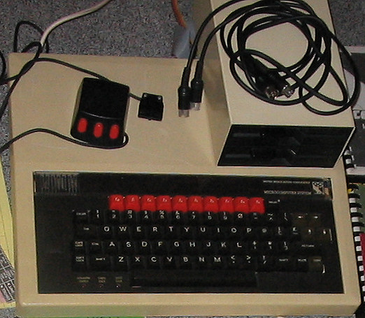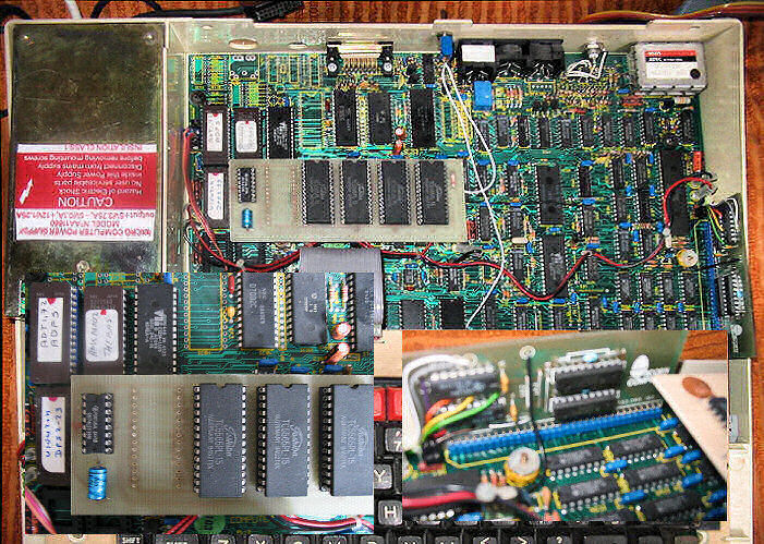 On top of the BBC you see the floppy drives and the AMX mouse. The inside picture shows the 64K Sideways RAM and the RAM on the spare socket left at the top. Blow-ups over the keyboard. In the ROM sockets the standard DFS and ADFS ROM's are present. The blue switch at the back side (right picture on top) provided write protect on the extended RAM board. Underneath the keyboard was the switch to choice between the two disk-filing systems. The MSX mouse ROM is just to see.